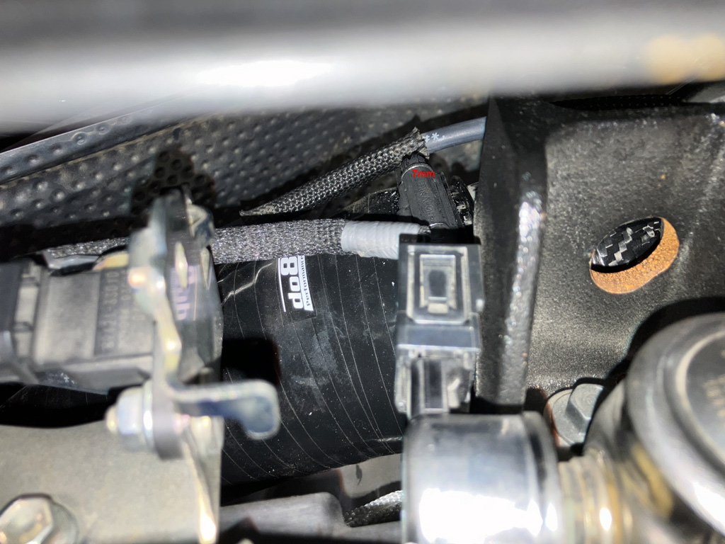 1. Temporarily disconnect mass air sensor wiring plug. I did cut a ziptie and temporarily remove my Flex Fuel Sensor wiring harness under the Eventuri scoop. I put it back later.