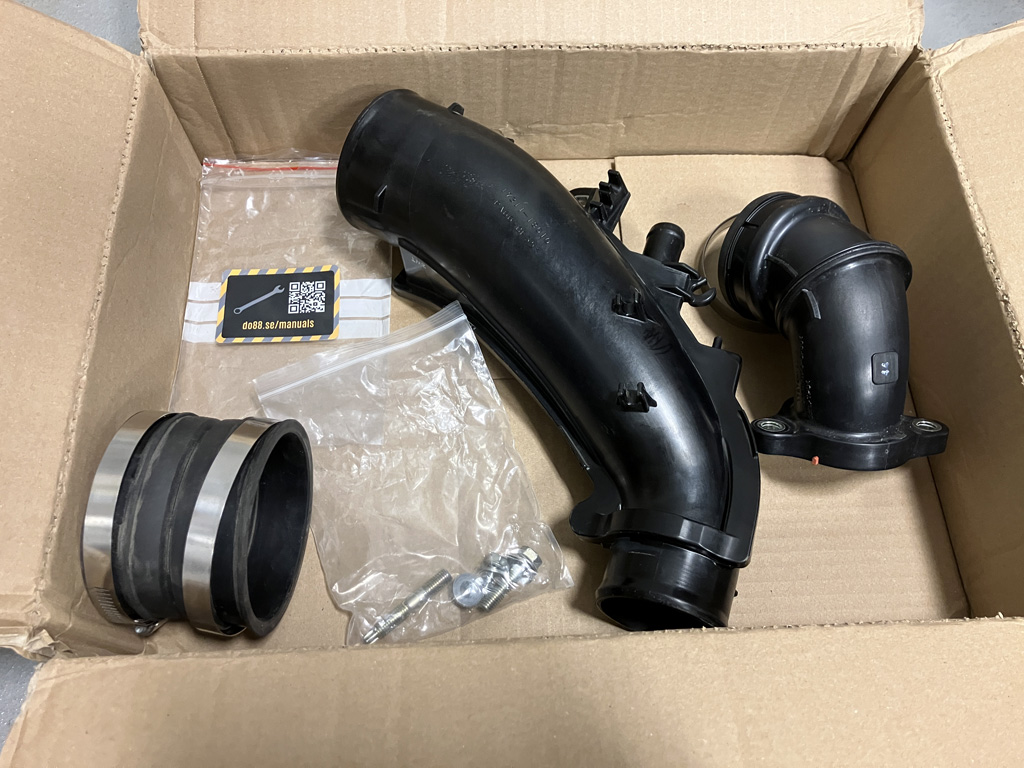 4. Reinstall OE intake box and piping behind engine under the wiper cowl. Or in my case, reinstall complete Eventuri intake. Connect (1) hose clamp to do88 turbo inlet hose.