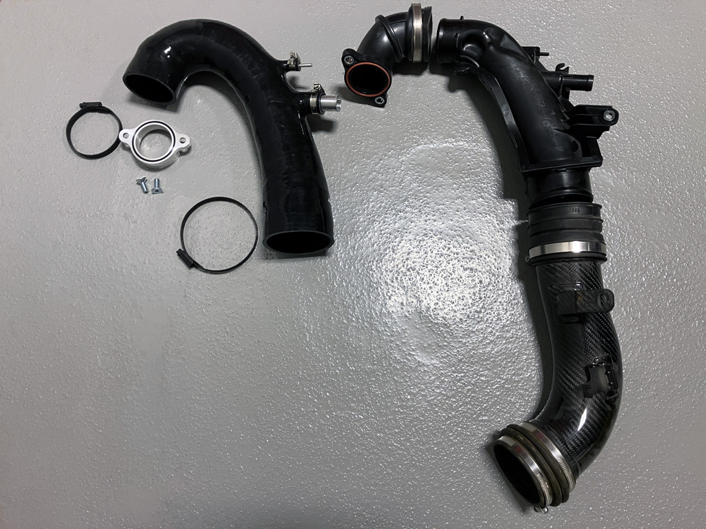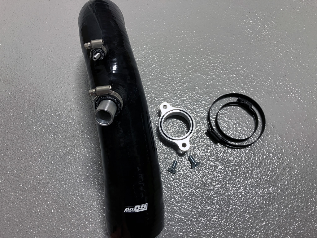 In steps do88 performance with their turbo inlet hose. This silicone hose replaces the OE turbo inlet elbow and plastic piping along the backside of the engine under the wiper cowl. In my case, I removed a rubber coupling on my back Eventuri pipe and joined it to the do88 turbo inlet hose with a hose clamp.
