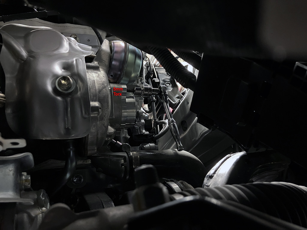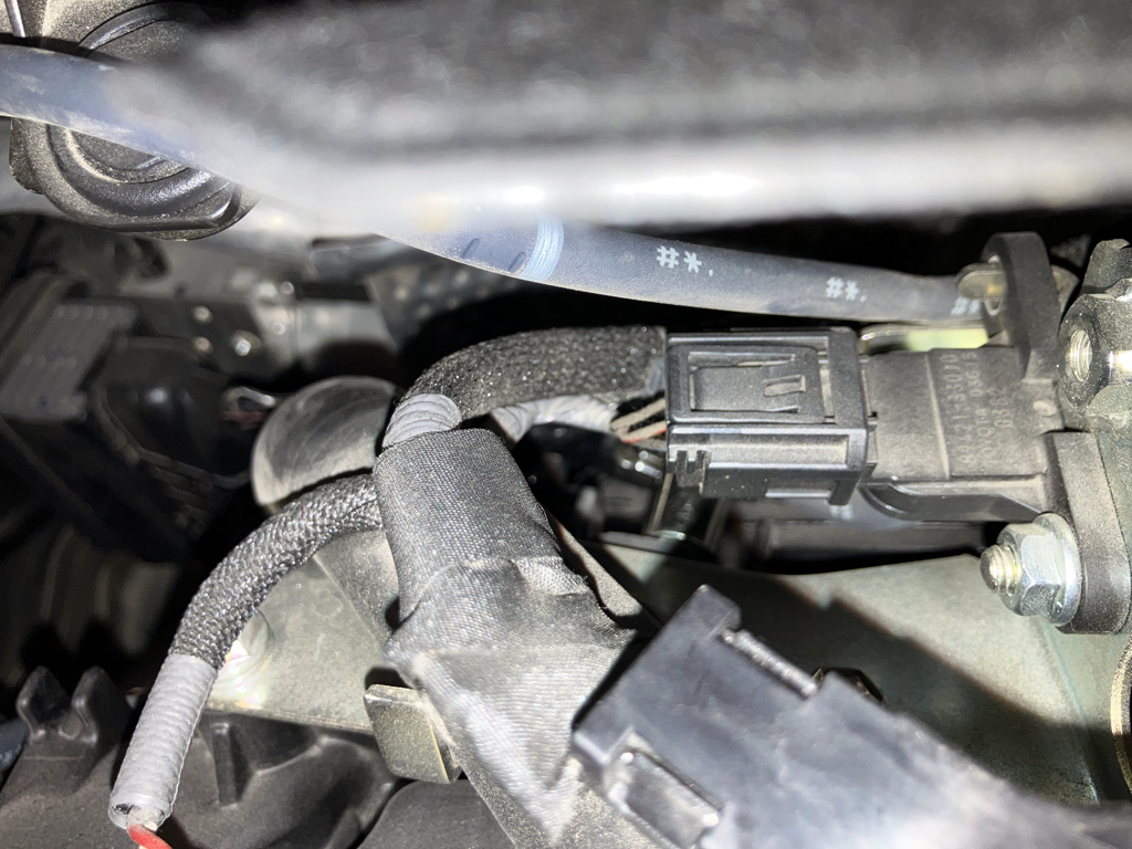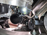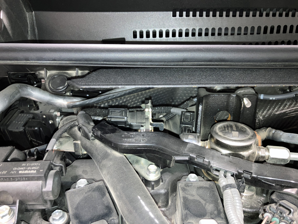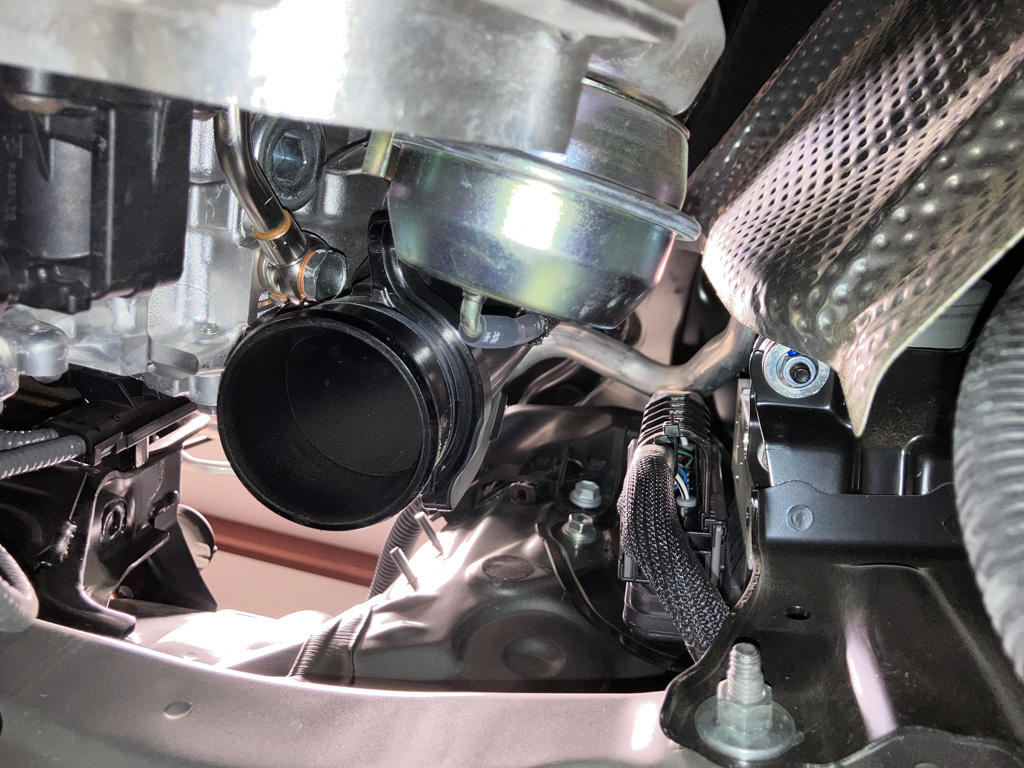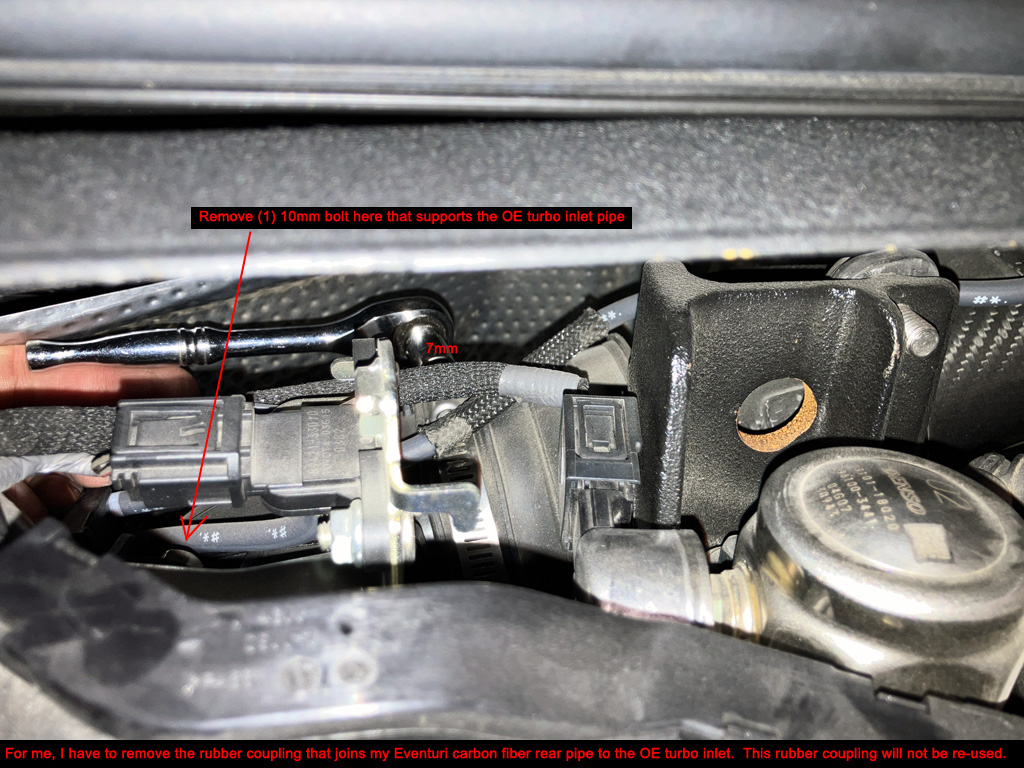 1. Temporarily disconnect mass air sensor wiring plug. I did cut a ziptie and temporarily remove my Flex Fuel Sensor wiring harness under the Eventuri scoop. I put it back later.
