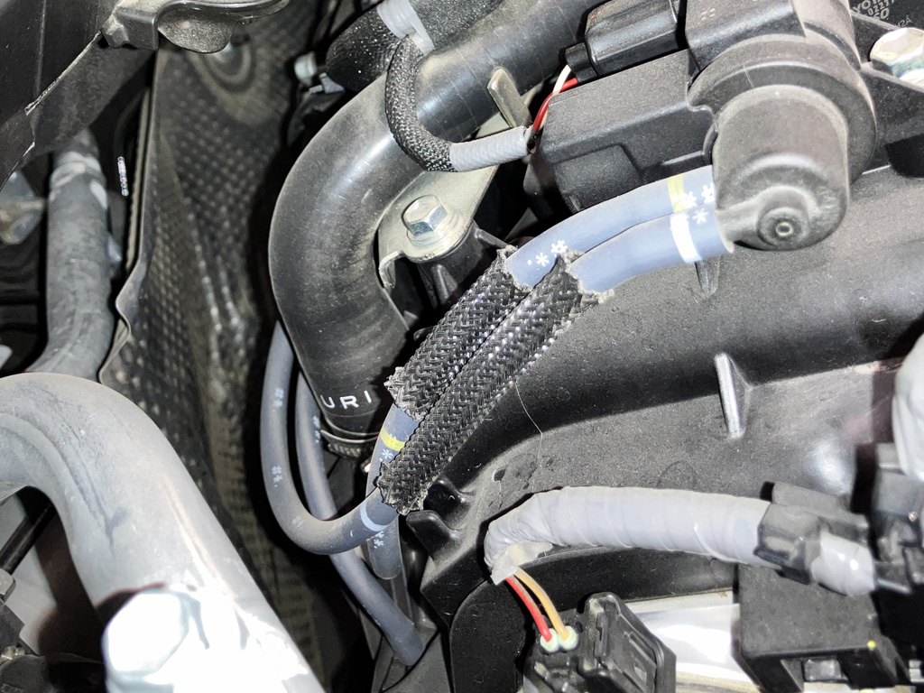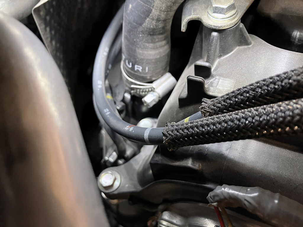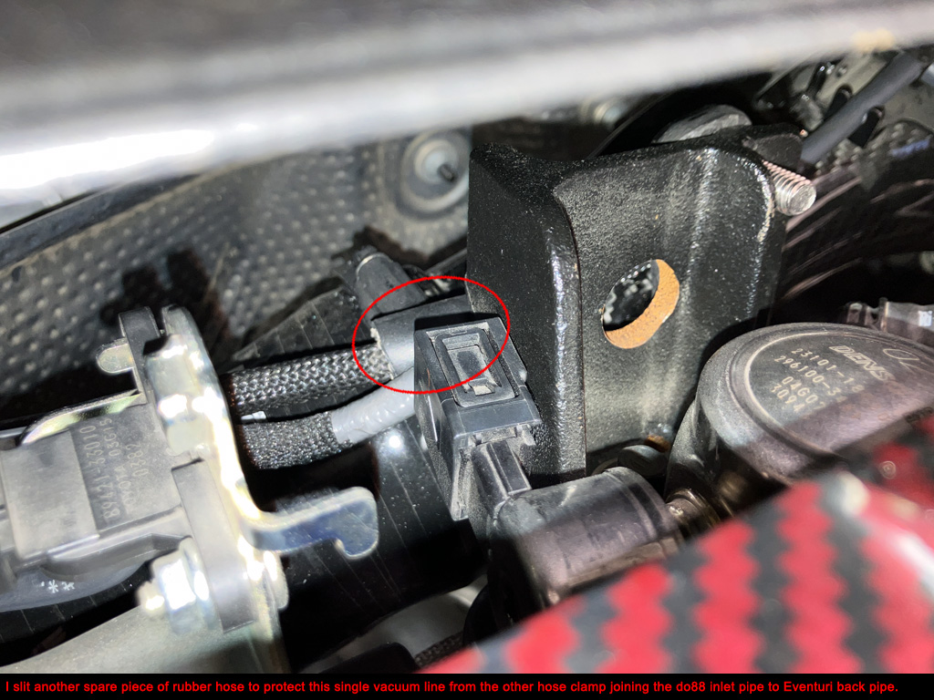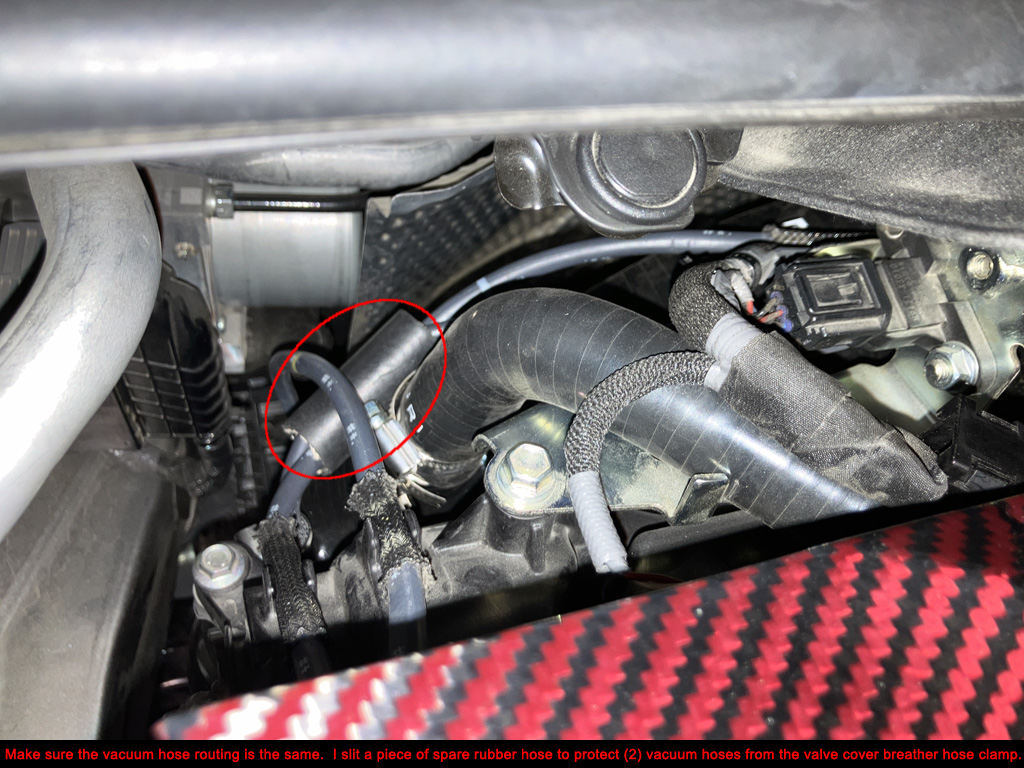 5. Verify all OE vacuum lines are routed in a safe manner. Don't let them touch hot stuff or sharp things. I slit sections of rubber hose and put them over the vacuum lines in (2) spots.