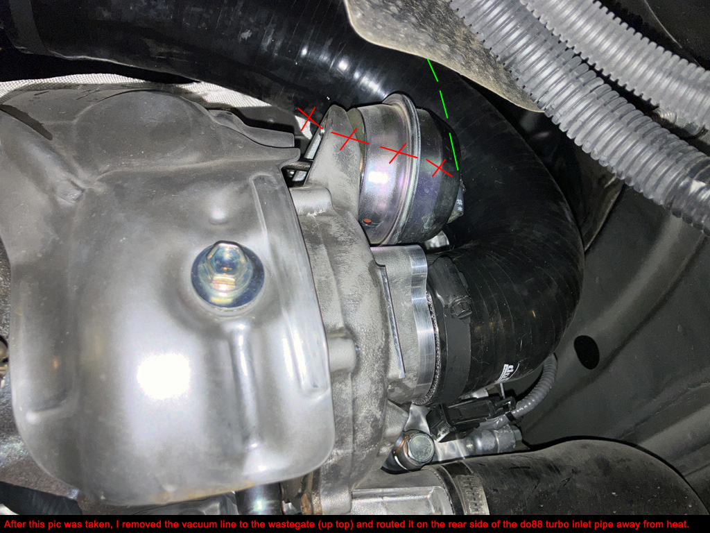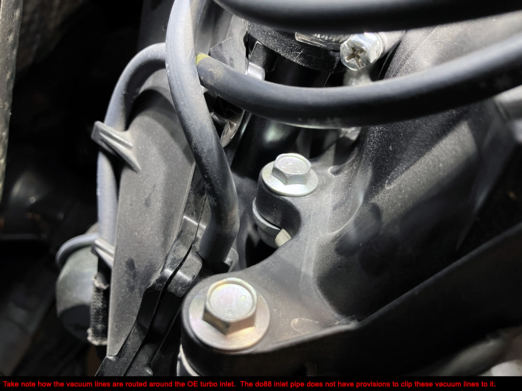3. Pay close attention to OE vacuum line routing. Don't let them touch hot stuff or sharp things. The do88 turbo inlet removes several spots to attach vacuum lines. Zip tie if needed.